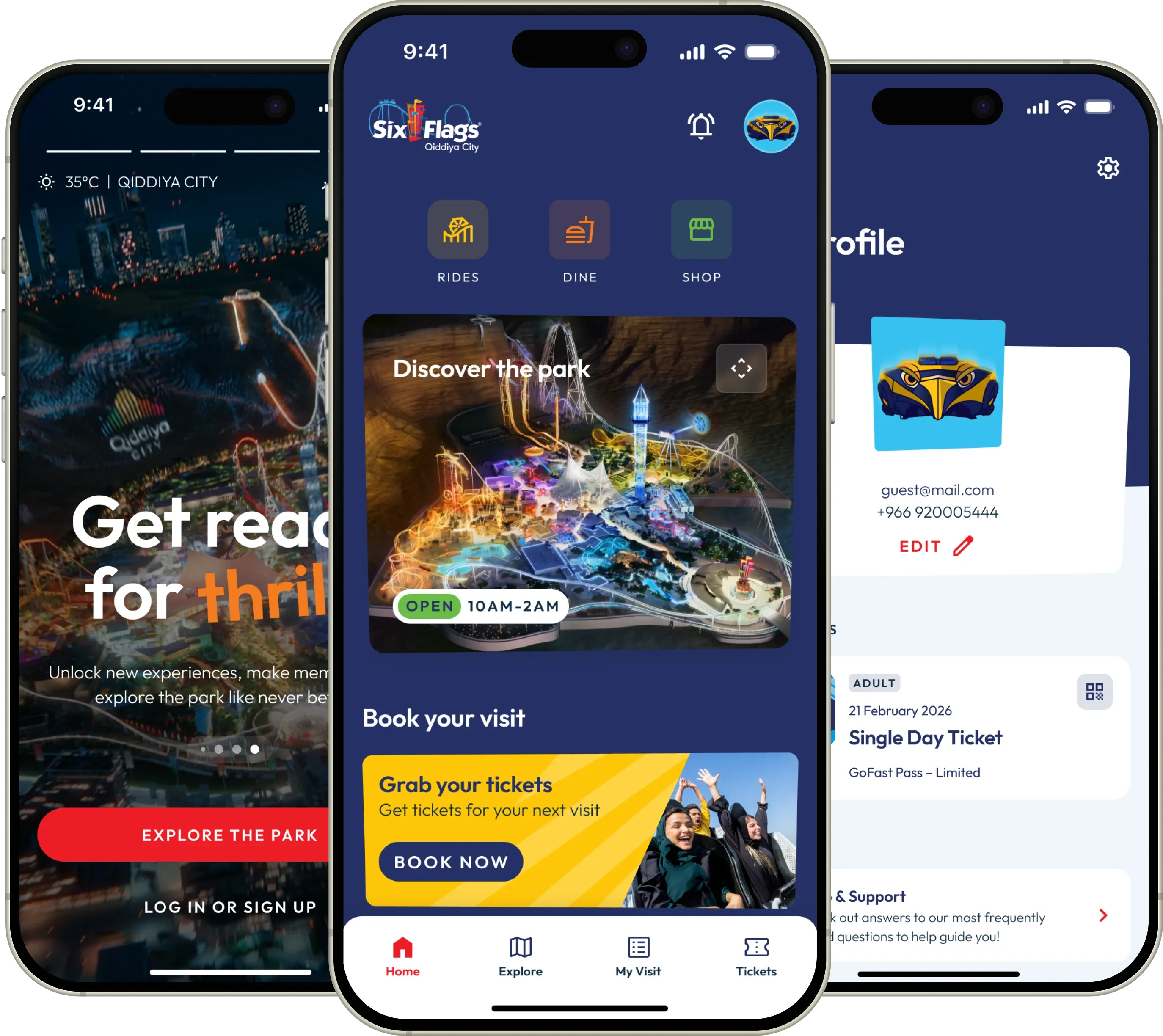The best theme park experience is available via our Six Flags Qiddiya City mobile app